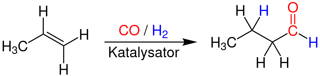 Dieses Bild zeigt die Hydroformylierung des Alkens Propen. Die Reaktion erfolgt bei 90 bis 125 ºC und 10 bis 60 bar Druck. Als Katalysator wird Rhodium verwendet oder auch sulfonierte Triarylphosphine in wässriger Lösung [1].