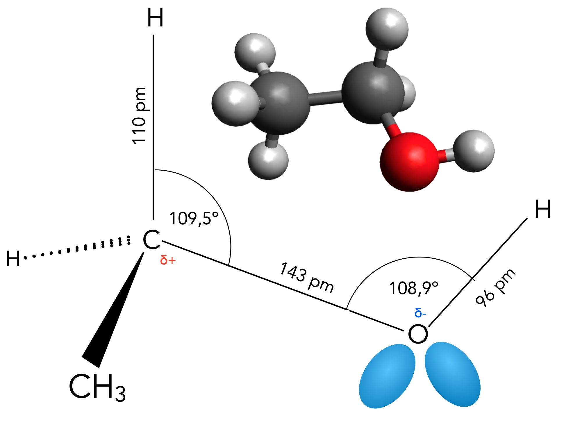 Die O-H-Bindung ist wegen der hohen Elektronegativität des O-Atoms recht kurz, nämlich nur 96 pm (beim Methanol und wahrscheinlich auch beim Ethanol). Durch die hohe EN sind die sp3-Orbitale des O-Atome kleiner als beispielsweise beim C-Atom, die Elektronen der O-H-Bindung halten sich mit höherer Wahrscheinlichkeit am O-Atom auf.