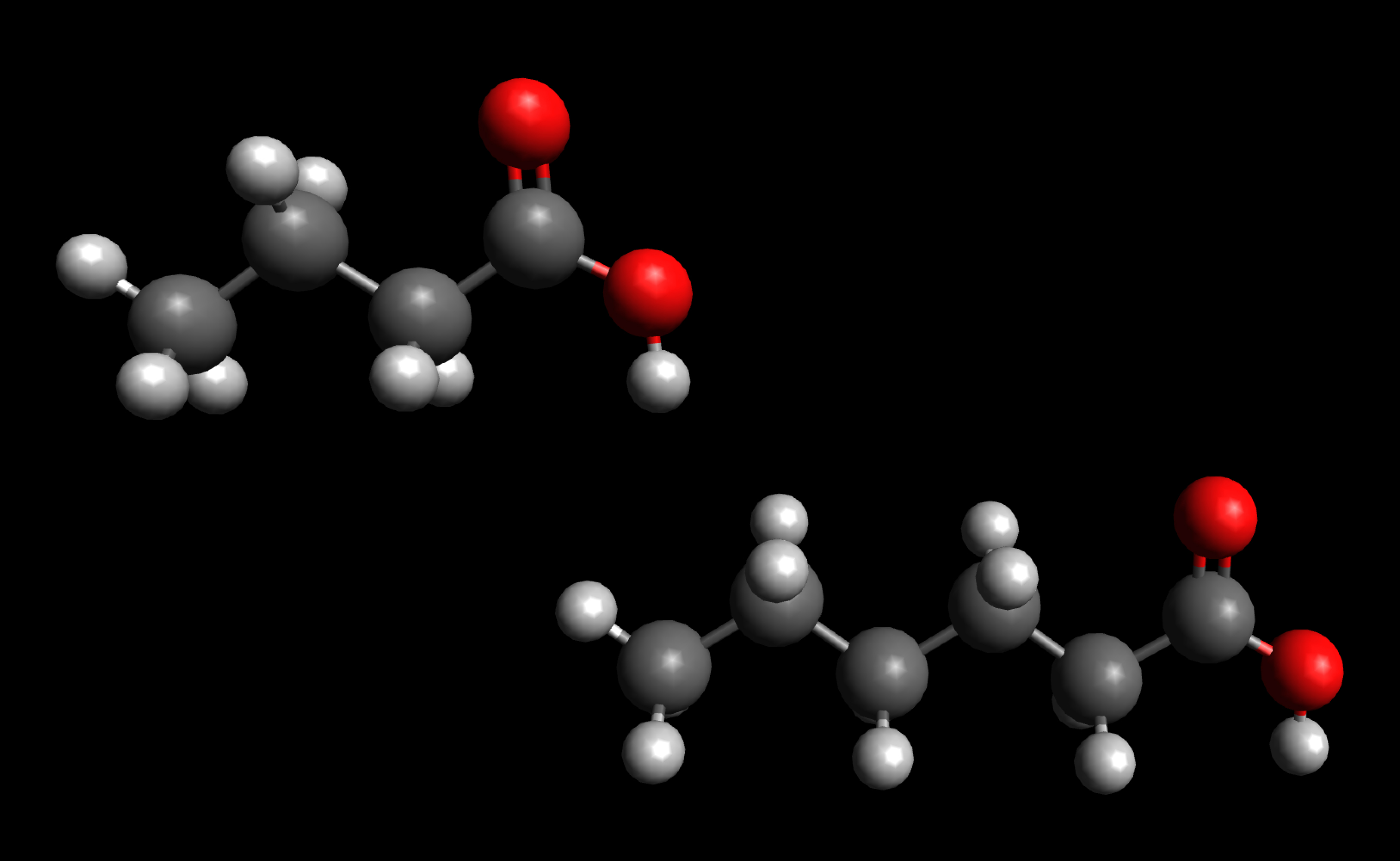 Buttersäure mit vier und Capronsäure mit sechs C-Atomen sind die beiden einfachsten Fettsäuren überhaupt. Da das Zeichnen von dreidimensionalen Strukturformeln nicht so ganz einfach ist, stellt man diese Fettsäuren in der Literatur meistens stark vereinfacht dar, und zwar so: