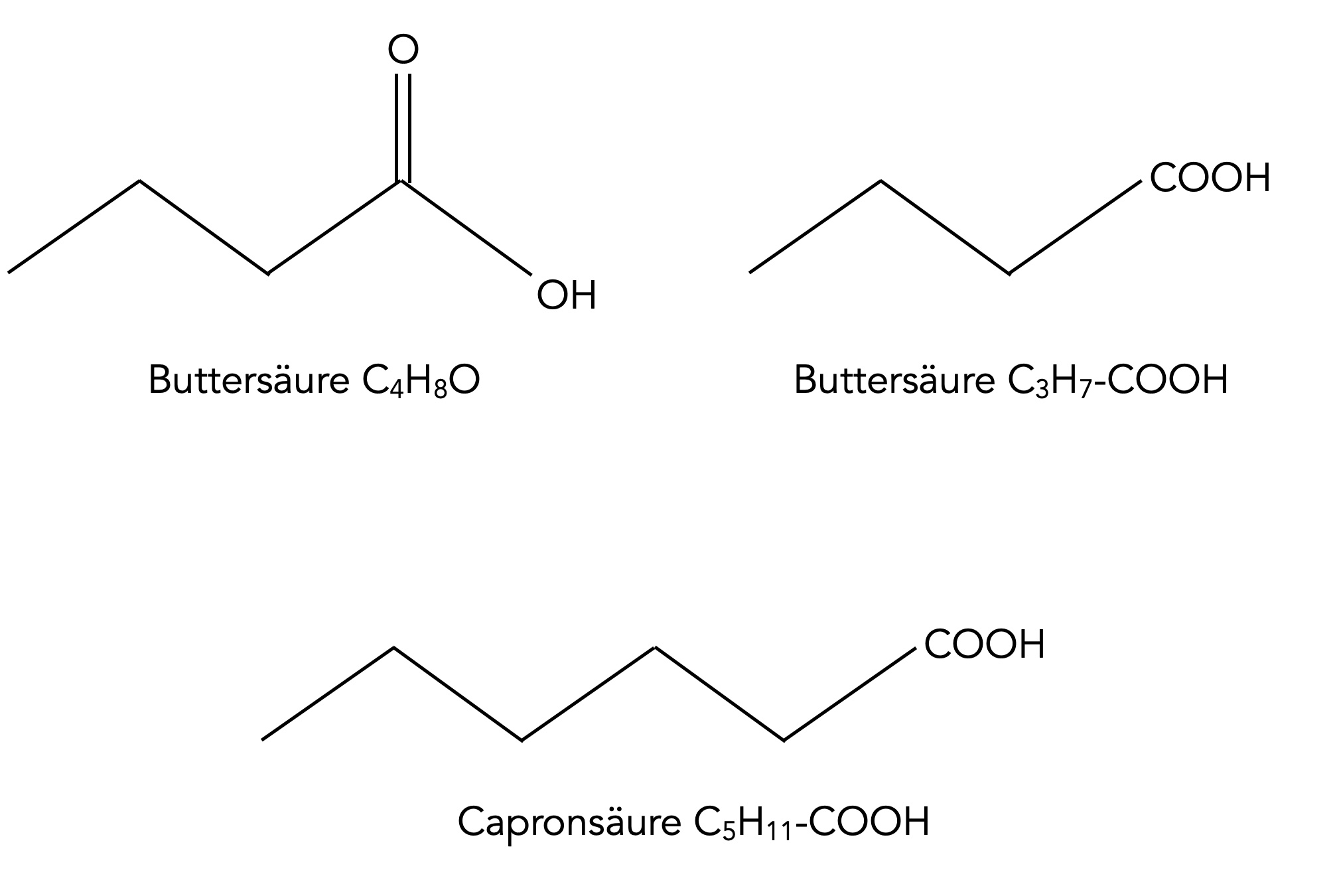 Buttersäure C3H7-COOH und Capronsäure C5H11-COOH sind die beiden einfachsten Fettsäuren