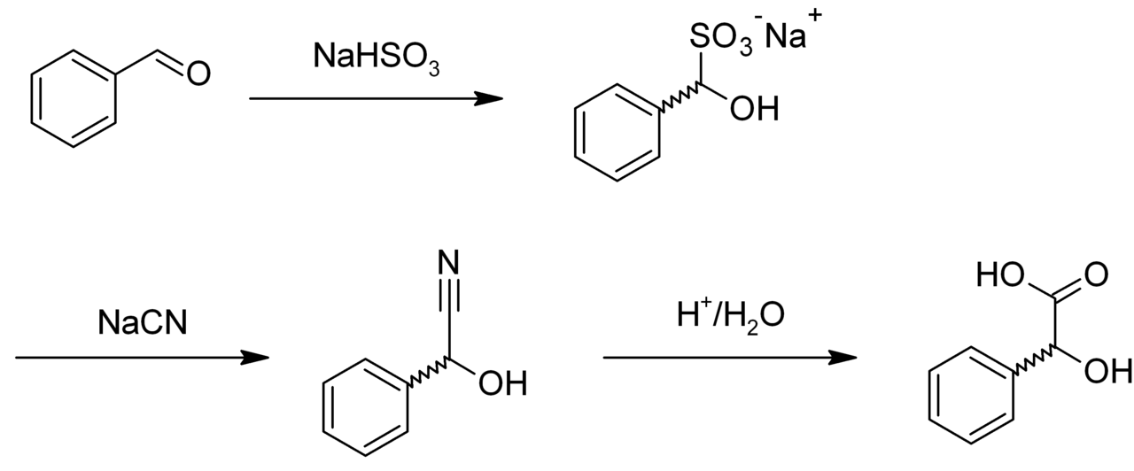 Die Mandelsäure gehört zu den aromatischen Hydroxycarbonsäuren. Sie kommt in Bittermandeln vor, wird aber heute meistens aus Benzaldehyd und Blausäure hergestellt, wie die folgende Abbildung zeigt: