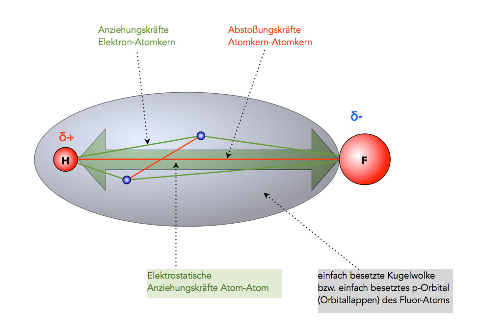 Elektrostatische Anziehung: Im HF-Molekül ist aufgrund der sehr unterschiedlichen Elektronegativitäten das F-Atom stark negativ polarisiert, während das H-Atom stark positiv polarisiert ist. Diese beiden entgegengesetzt polarisierten Atome ziehen sich nun elektrostatisch gegenseitig an.