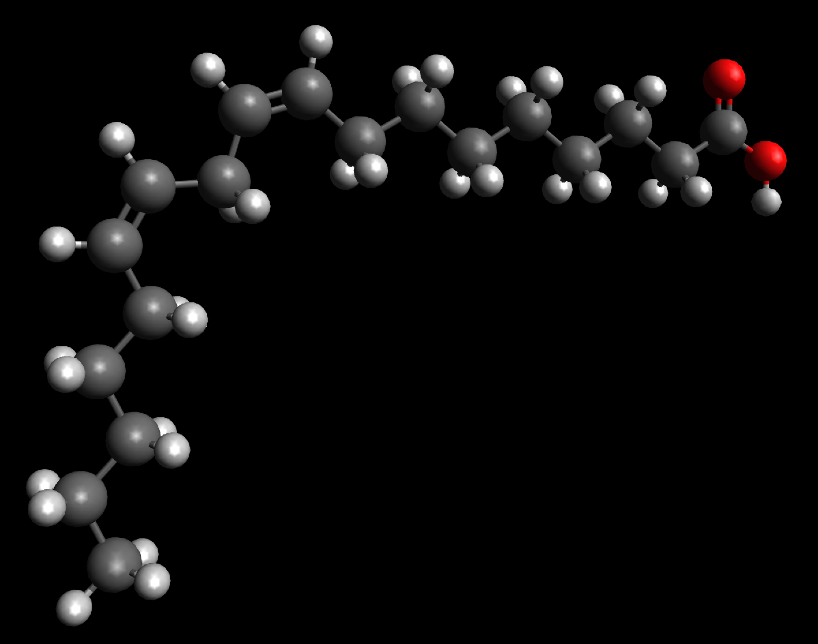 Die Abbildung 2 zeigt ein Molekülmodell der Linolsäure, dabei wurde die energetisch günstigste Konformation berechnet. Was man gut sehen kann, sind die beiden cis-Doppelbindungen im Molekül. Das Alpha-Ende mit der COOH-Gruppe befindet sich rechts im Bild, das Omega-Ende mit der CH3-Gruppe links.
