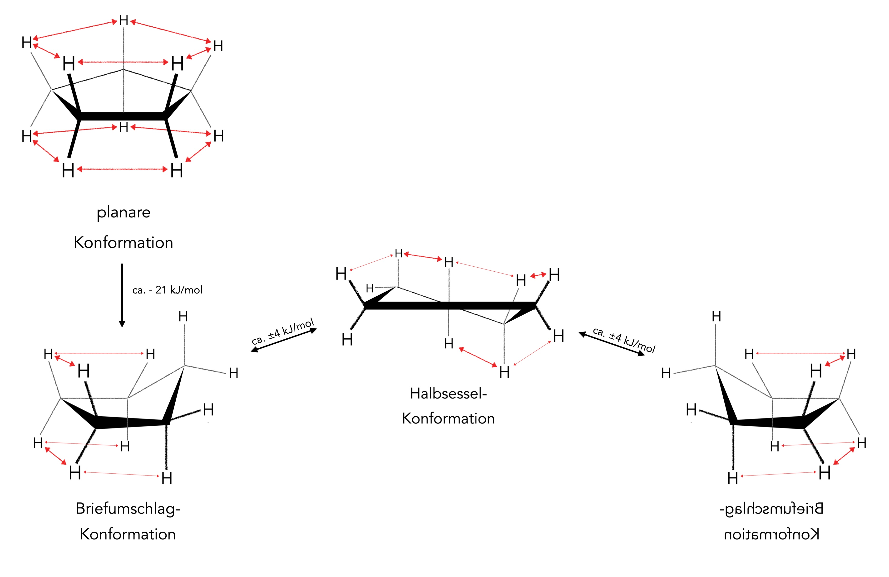 Es gibt eine zweite Briefumschlag-Konformation mit dem gleichen Energiegehalt, um in diese zweite Konformation umzuklappen, muss die energetisch ca. 4 kJ/mol höher liegende Halbsessel-Konformation durchlaufen werden. Hier sind die H-Atome so angeordnet, dass drei starke Abstoßungskräfte und zwei bis drei schwächere wirken.