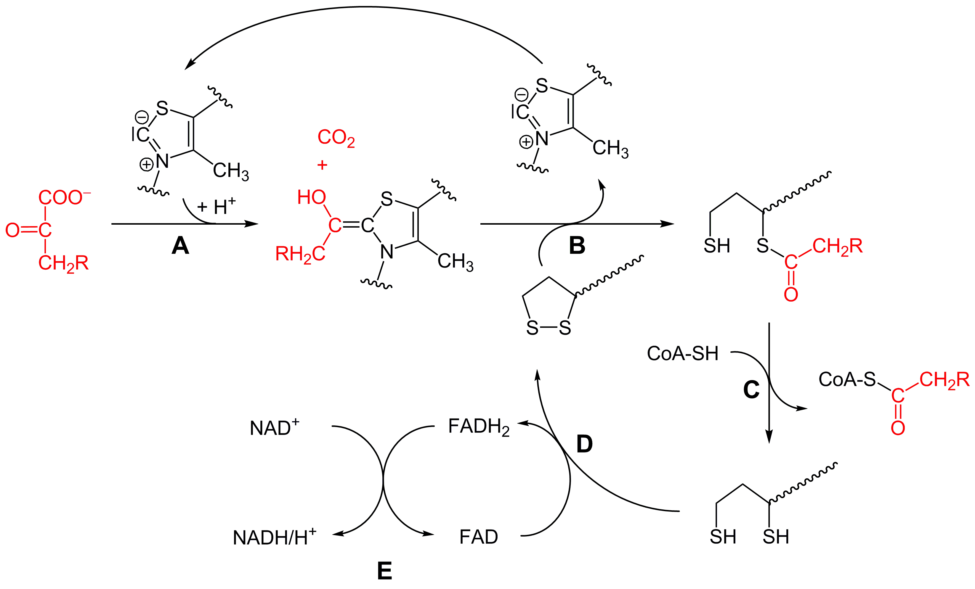 Die Ethanol-Gruppe wird vom Thiazolring des Thiamins auf Liponamid übertragen. Dabei wird der Alkohol wieder zum Keton oxidiert (aus C-OH wird C=O). Wenn man sich den gezeigten Teilschritt näher anschaut, sieht man auch, wer für diese Oxidation verantwortlich ist, nämlich die beiden Schwefel-Atome des Liponamids, diese werden bei der Reaktion reduziert. Außerdem wird das TTP bei diesem Schritt regeneriert und steht wieder für den Teilschritt A zur Verfügung. Auch für diesen Teilschritt ist das Enzym Pyruvat-Dehydrogenasezuständig.