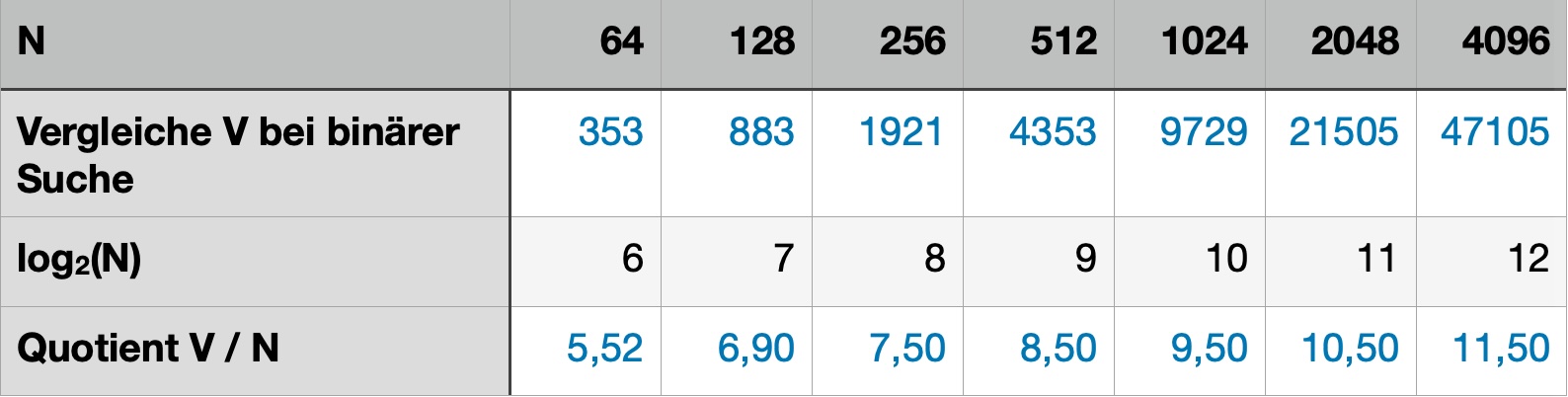 Lineare Suche für 64 Zahlen = 2608 Vergleiche Binaere Suche für 64 Zahlen = 353 Vergleiche Verhältnis Linear/Binär = 7,39 Lineare Suche für 128 Zahlen = 10336 Vergleiche Binaere Suche für 128 Zahlen = 833 Vergleiche Verhältnis Linear/Binär = 12,41 Lineare Suche für 256 Zahlen = 41152 Vergleiche Binaere Suche für 256 Zahlen = 1921 Vergleiche Verhältnis Linear/Binär = 21,42 Lineare Suche für 512 Zahlen = 164224 Vergleiche Binaere Suche für 512 Zahlen = 4353 Vergleiche Verhältnis Linear/Binär = 37,73 Lineare Suche für 1024 Zahlen = 656128 Vergleiche Binaere Suche für 1024 Zahlen = 9729 Vergleiche Verhältnis Linear/Binär = 67,44 Lineare Suche für 2048 Zahlen = 2622976 Vergleiche Binaere Suche für 2048 Zahlen = 21505 Vergleiche Verhältnis Linear/Binär = 121,97 Lineare Suche für 4096 Zahlen = 10488832 Vergleiche Binaere Suche für 4096 Zahlen = 47105 Vergleiche Verhältnis Linear/Binär = 222,67