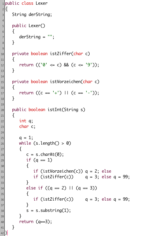 Hier sehen Sie den Java-Quelltext einer Klasse Lexer, die einen ganz primitiven Lexer zur Verfügung stellt. Die Hauptmethode dieser Klasse ist istInt. Diese Methode überprüft einen Eingabestring s daraufhin, ob es sich um eine lexikalisch korrekte int-Zahl handelt. Dazu wird der determinierte endliche Automat für int-Zahlen modelliert, in dem Quelltext können Sie die drei Zustände 1, 2 und 3 erkennen.