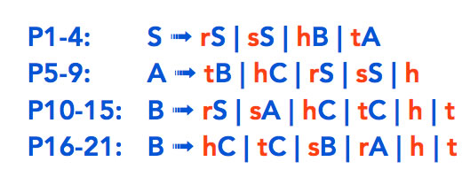 Hier handelt es sich eindeutig um eine rechtslineare Grammatik; alle 21 Produktionen haben auf der rechten Seite entweder ein Terminal {r, s, h, t} oder ein Terminal, gefolgt von einem Nichtterminal.